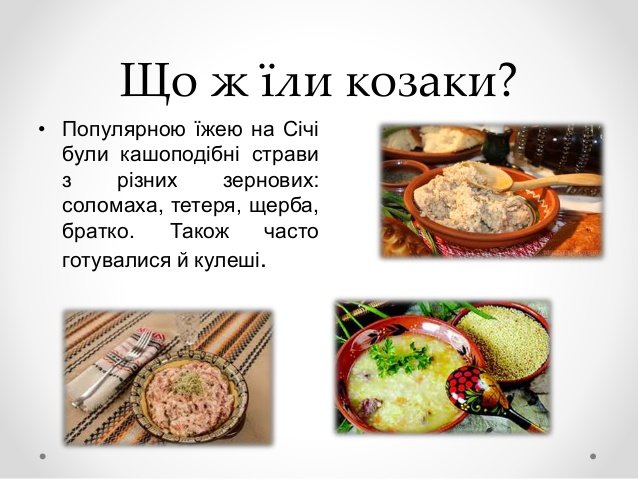 También eran gustosos del “козацьку тетерю” – “Teteryu de Kozako”: un caldo de pescado en Kvasa, con harina de trigo y mijo; o el “куліш”, también a base de mijo.