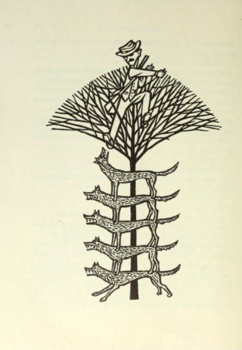 Y de nuevo fue directo ante Dios, y le dijo: “Dios, ¡Magnificencia, el Misericordioso! Dame algo de comer, aunque sea unas migajas, o caeré por tanta hambre que tengo.”- “Allá abajo camina un sastre”, le dijo Dios.”Simplemente cáele encima, y haz lo mejor con él “.-“¡Buena salud, señor sastre!”.-“Buena salud”.-“Dios me dijo que me lo comeré a Usted”.-“¿Y que clase de criatura eres tu que vas a comerme?”, le respondió el sastre.- “¡Un lobo!”, respondió.- “No. Tu estás mintiendo. ¡Tu eres un perro!”.-“Creame”, le respondió, “¡Soy un lobo!”.- “¡Pero qué pequeño eres!”, le dijo el sastre, “Ven aquí, te tomaré medidas”.El sastre tomó la cola de lobo en su mano, y comenzó a tomarle medidas: “Largo: ¡arshin!”, gritó, halandole la cola, “ancho: ¡Arshin!”.El lobo sabía totalmente que la palabra “Arshin” es una medida que utilizan los sastres, por lo que permaneció aguantando la respiración lo mejor que pudo mientras el sastre le tomaba las medidas.El hombre continuó midiéndolo y halándole la cola hasta que ésta se le desprendió, quedando en la mano del sastre. Entonces el lobo corrió de dolor, pero esta vez no fue con Dios, sino con otros lobos.- “¡Lobos!,¡Hermanos!, ¡Que gran calamidad!”.Todos los lobos salieron corriendo en busca del sastre. Éste los vio y, ¡Problemas! ¿Que hacer ahora?. Frente a él vio un árbol. De un brinco se subió hasta la punta. Los lobos rodearon el árbol y, saltando, mordían el aire intentando agarrar al sastre.Pero el lobo pensó un mejor plan, y les dijo: “Lobos, amigos. Así no lo alcanzaremos. Mejor subíos en mi lomo, uno por uno, y hacemos una torre que será tan alta y lograremos atrapar al vil sastre”.Eso hicieron. Subieron uno sobre el otro, ¡qué escalera hicieron!. Entonces el lobo de hasta arriba dijo: “¡Baja de allí, vil sastre!¡Ya te tenemos!¡Ahora te vamos a comer!”.- “Ah, queridos amigos lobos, ¡tened piedad de mi!, ¡No me comáis!”.- “¡No!” Dijo el lobo de hasta arriba, “¡No hay manera!¡Baja ya!”.- “Bien, espera un poco”, dijo el sastre, “Solamente déjame oler por última vez mi tabaco. Si mi alma va a ir al cielo, quiero que vaya feliz”.Entonces olió el tabaco: “¡HAAACHIS!” , estornudó.Pero el lobo de hasta abajo, el que no tenía cola, escuchó que el sastre decía “Arshin” y, por el miedo, se le debilitaron las patas, y toda la torre de lobos cayó. ¡Que desastre!. El lobo de abajo salió gritando de allí aterrado, y todos sus hermanos tras él.El sastre bajó del árbol y agradeció a Dios: “¡Gracias, Dios!. ¡Gracias por no permitir que un alma cristiana cayera ante semejantes bestias!”.Y fue con seguridad a casa, con su esposa e hijos, y todos comieron Varenyky.