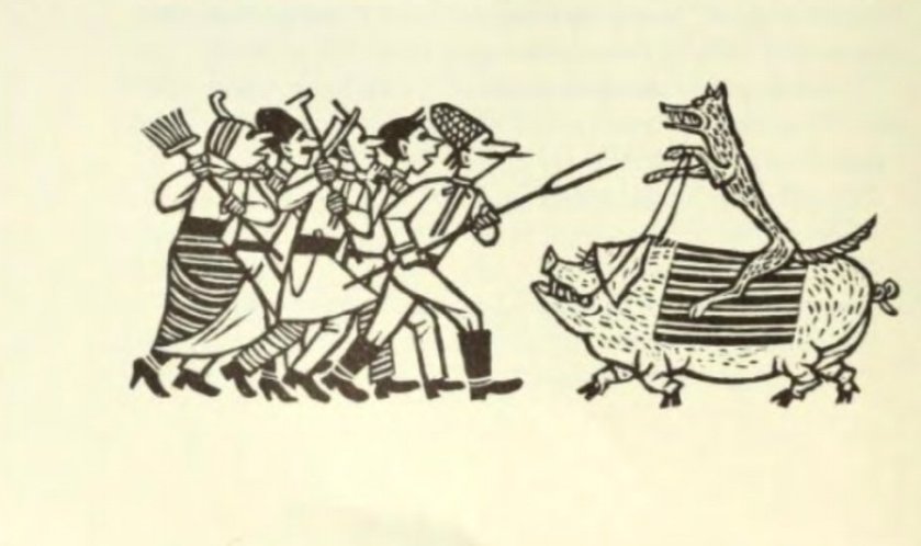 El lobo pensó y pensó. Y no tuvo más remedio que ir a presentarse ante Dios, a quién le dijo entonces: “¡Oh Dios, Todopoderoso!, ¡El más misericordioso!, Dame algo de comer, aunque sea un poquito, o si no, no viviré mucho tiempo más”.-“Ya estoy hasta el copete con tu hambre”, le dijo Dios, “¿Que más puedo hacer contigo?. Ve no lejos de la aldea, allí hay un cerdo comiendo; lo puedes comer.”-“¡Buena salud, señor cerdo!”.-“Buena salud”.-“Dios me dijo que me lo comeré a Usted”.-“¿Y que clase de criatura eres tu que vas a comerme?”, le respondió el cerdo.- “¡Un lobo!”, respondió.- “No. Tu estás mintiendo. ¡Tu eres un perro!”.-“Creame”, le respondió, “¡Soy un lobo!”.-“Y que pasa ahora “, contestó el cerdo, “¿No hay nada mejor para los lobos hoy en día?”-“¡Nada de nada!”.-“Ya que no hay nada”, le dijo el porcino,, “súbete sobre mi lomo. Te llevaré a la aldea. En mi aldea están ahora reclutando a todo tipo de oficiales; tal vez te contraten, y entonces tendrás todo lo que quieras comer.”-“¡Asi sea…Llévame!”.El lobo entonces se montó sobre el lomo del cerdo, que se dirigió a la aldea. Poco antes de llegar al poblado, el cerdo comenzó a chillar a todo pulmón, lo que asustó al lobo y le preguntó: “¿Que te pasa?, ¿Porqué gritas asi?”.-“Estoy llamando a los aldeanos”, dijo el cerdo, “¡Asi se apuran a contratarte y puedes comer más rápido!”.Pero la gente salió de sus casas con atizadores, horcas de horno, palas y cualquier cosa que tuviesen a mano. El lobo, asustado y sin aliento de terror, susurró al cerdo: “¿Porqué corren tantas personas?”.-“Porque vienen por ti.”, dijo el cerdo.La gente lo comenzó a pinchar, golpear y atizar, a tal punto que perdió todo afán por el cerdo. Apenas salió vivo de ésta.