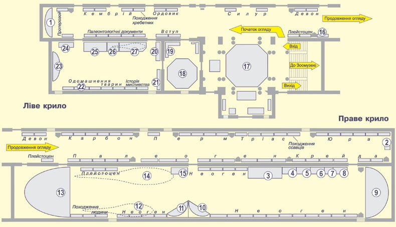 La historia geológica de Ucrania es tal que no todos los períodos de la evolución orgánica son bien representados en el registro fósil. Por ejemplo, prácticamente todo este territorio yacía en el fondo del antiguo océano llamado Tetis durante la era Mezozoica. Por dicha razón es que el museo carece casi de restos de dinosaurios, un tema de especial interés para visitantes.