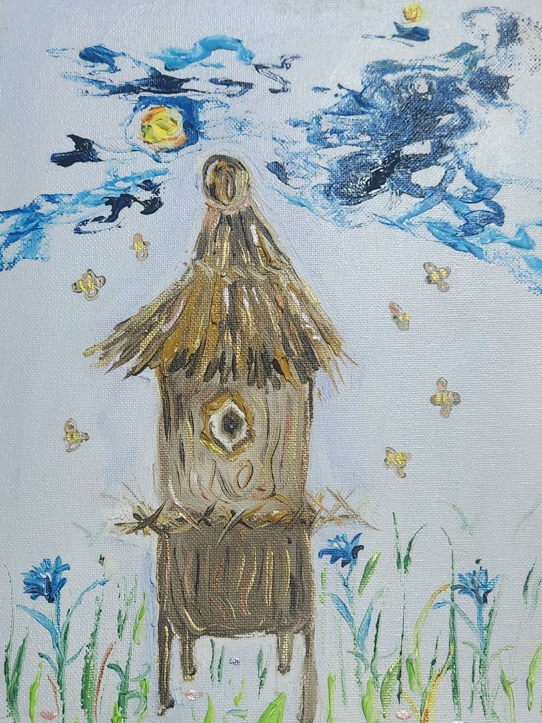 Una imagen es de la Сапе́тка, una colmena en un cesto. Y comparto también una pintura de mi esposa.