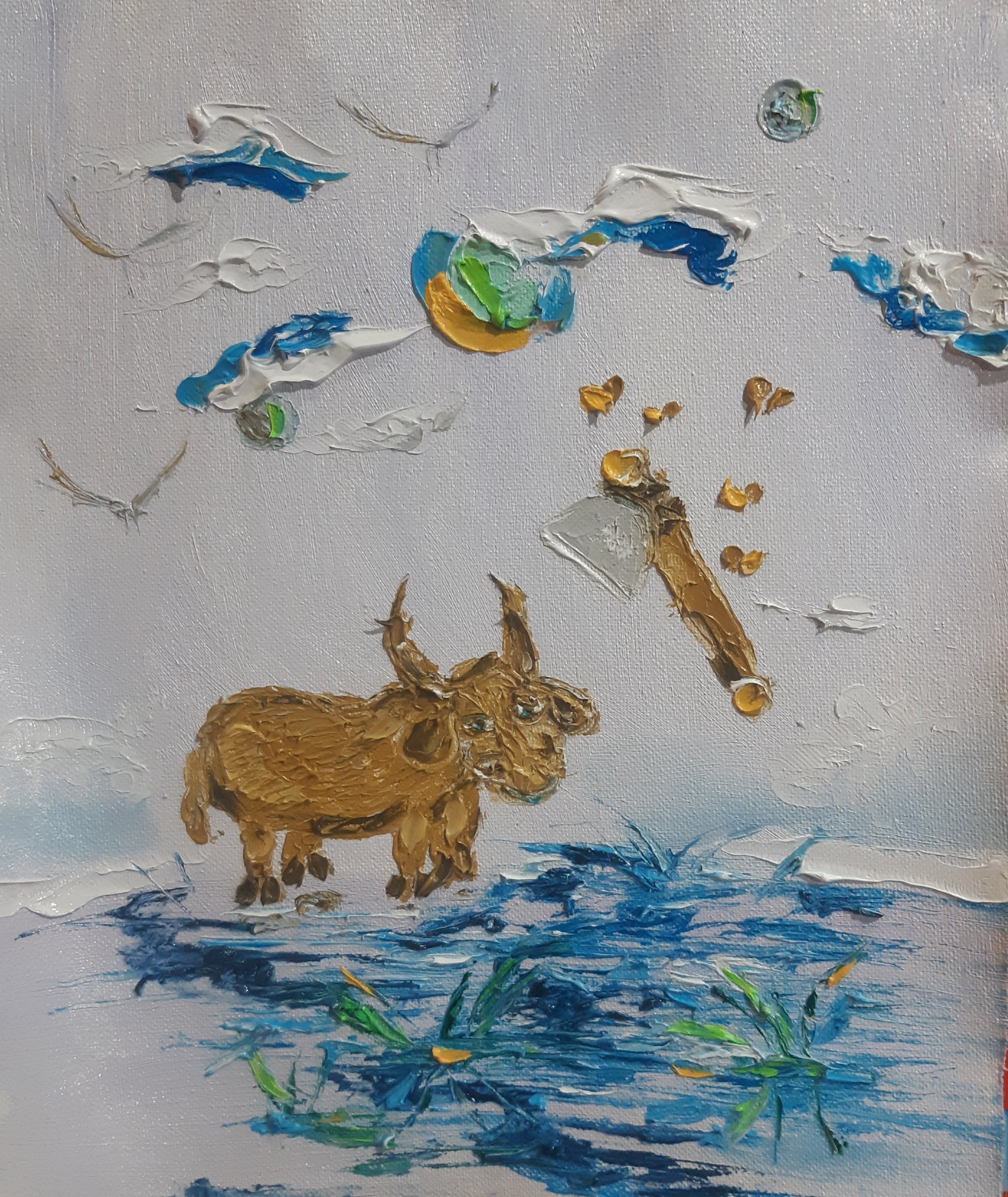 Entonces el gorrión fue con el buey, y le dijo, “¡Buey, bébete el agua, pues el agua no quiere apagar el fuego, y el fuego no quiere quemara a los tártaros, y los tártaros no quieren asesinar a la gente, y la gente no quiere matar al lobo, y el lobo no quiere comerse a la cabra, y la cabra no quiere mordisquear al arbusto, y el arbusto no quiere columpiar al pequeño gorrión!“.