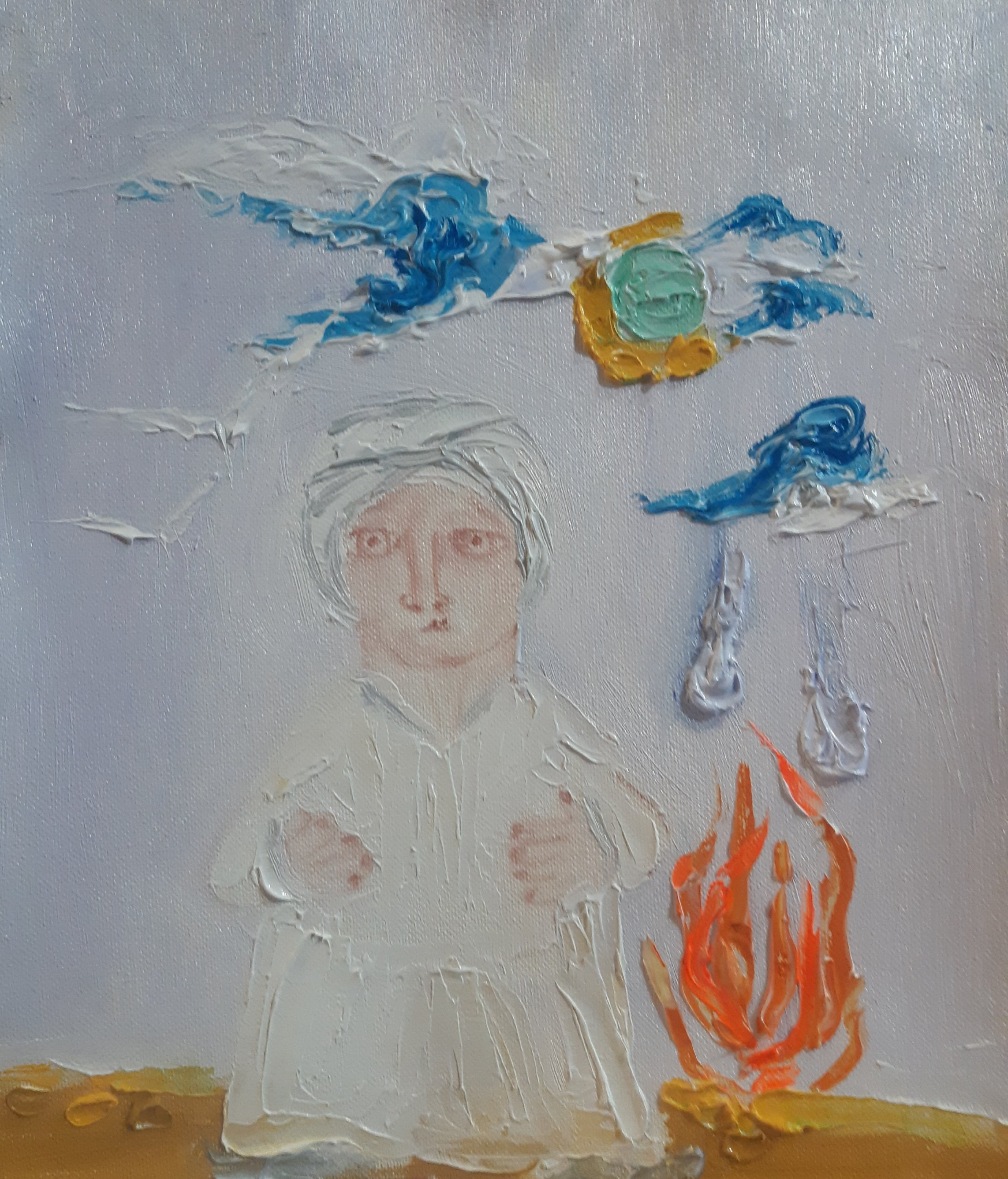Entonces el gorrión fue con el agua y le dijo, “¡Ven agua, apaga el fuego, el fuego no quiere quemar a los tártaros, los tártaros no quieren asesinar a la gente, la gente no quiere matar al lobo, el lobo no quiere comerse a la cabra, la cabra no quiere mordisquear al arbusto, el arbusto no quiere columpiar al pequeño gorrión!.”