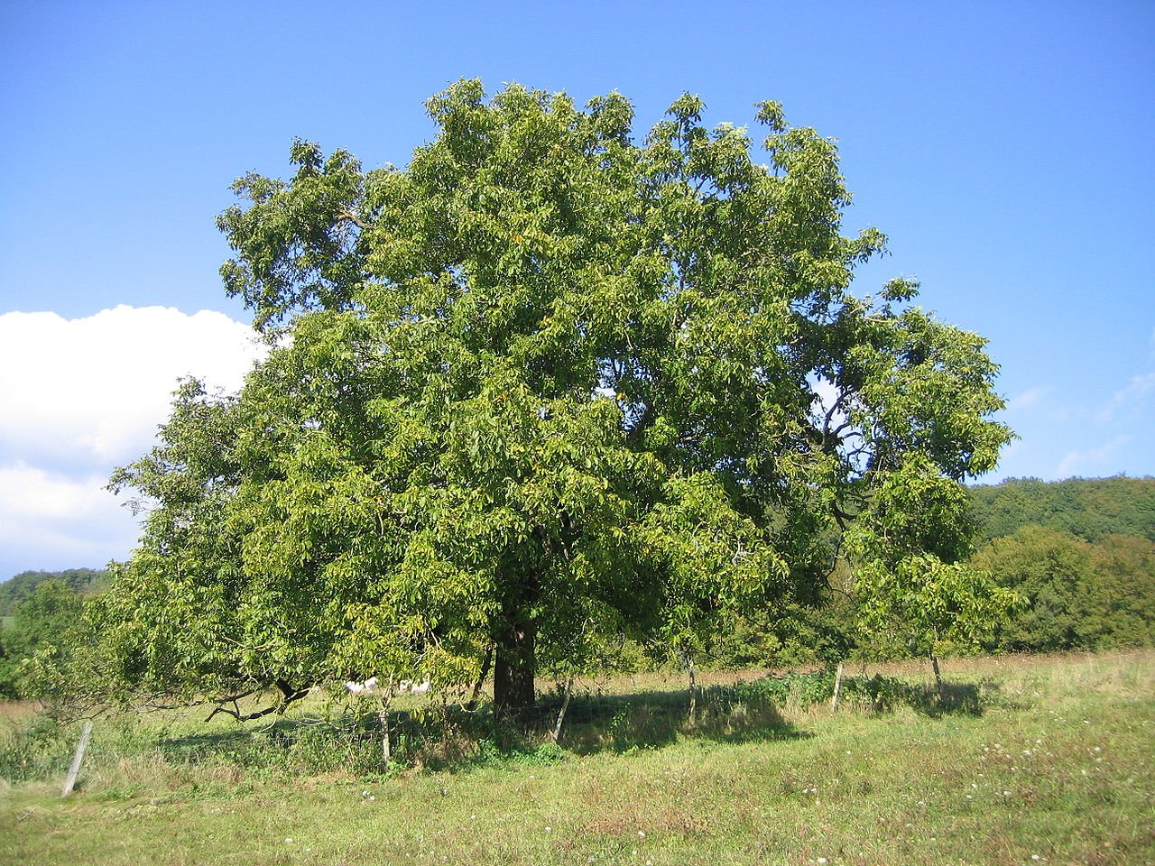 Juglans regia es el conocido como Nogal común, nogal europeo o nogal español. De la familia de las juglandáceas, esta es la especie de ella que está más difundida por toda Europa. Su altura más común es de 25 metros, con un diámetro de tronco de hasta 2 m. Las hojas contienen materias tánicas, ácido elágico y ácido gálico y, cuando están frescas, juglona —que es una oxinaftoquinona formada secundariamente a partir de la hidroyuglona α— e inosita. La juglona, que es abundante también en las raíces del nogal, produce alelopatía negativa vegetal, o sea que inhibe el crecimiento de otras plantas de su entorno para evitar la competencia.