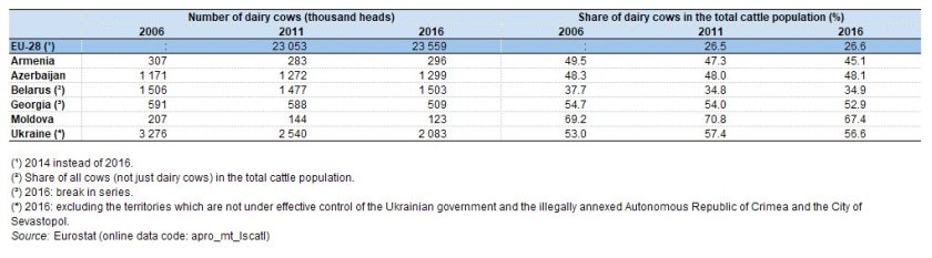 La producción de leche liquida continuó disminuyendo en 2017, siguiendo la tendencia a largo plazo debido a la disminución de cabezas. Dicha tendencia continúa hasta 2018 pero con una menor velocidad. Pero, a pesar de la reducción en cantidad de vacas lecheras y del consumo doméstico, los números de exportación de mantequilla aumentaron relevantemente. En 2017 Ucrania importó quesos duros. La exportación de lácteos y procesados a Rusia se detuvo por completo en 2015.