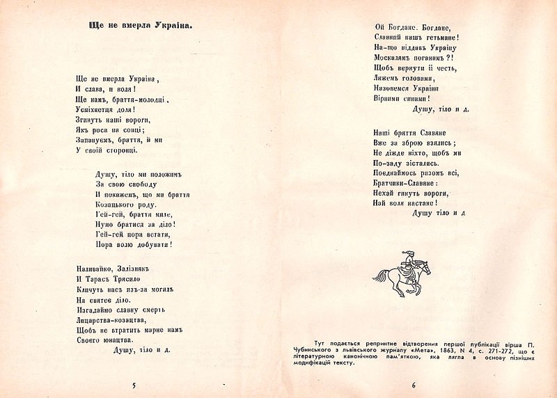 Ще не вмерла України, ні слава, ні воля, Ще нам, браття українці, усміхнеться доля. Згинуть наші вороженьки, як роса на сонці, Запануєм і ми, браття, у своїй сторонці.