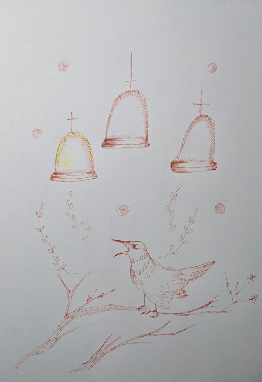 Горіла сосна, палала, Під нею дівка стояла.Ardía el pino, abrazado por el fuego, Una joven yacía debajo de él,Під нею дівка стояла, Русяву косу чесала. Y debajo de él una joven yacía, Peinando sus castañas trenzas.– Ой коси, коси ви мої, Довго служили ви мені. -Oh trenzas, trenzas mías, Útiles me fueron mucho tiempo.