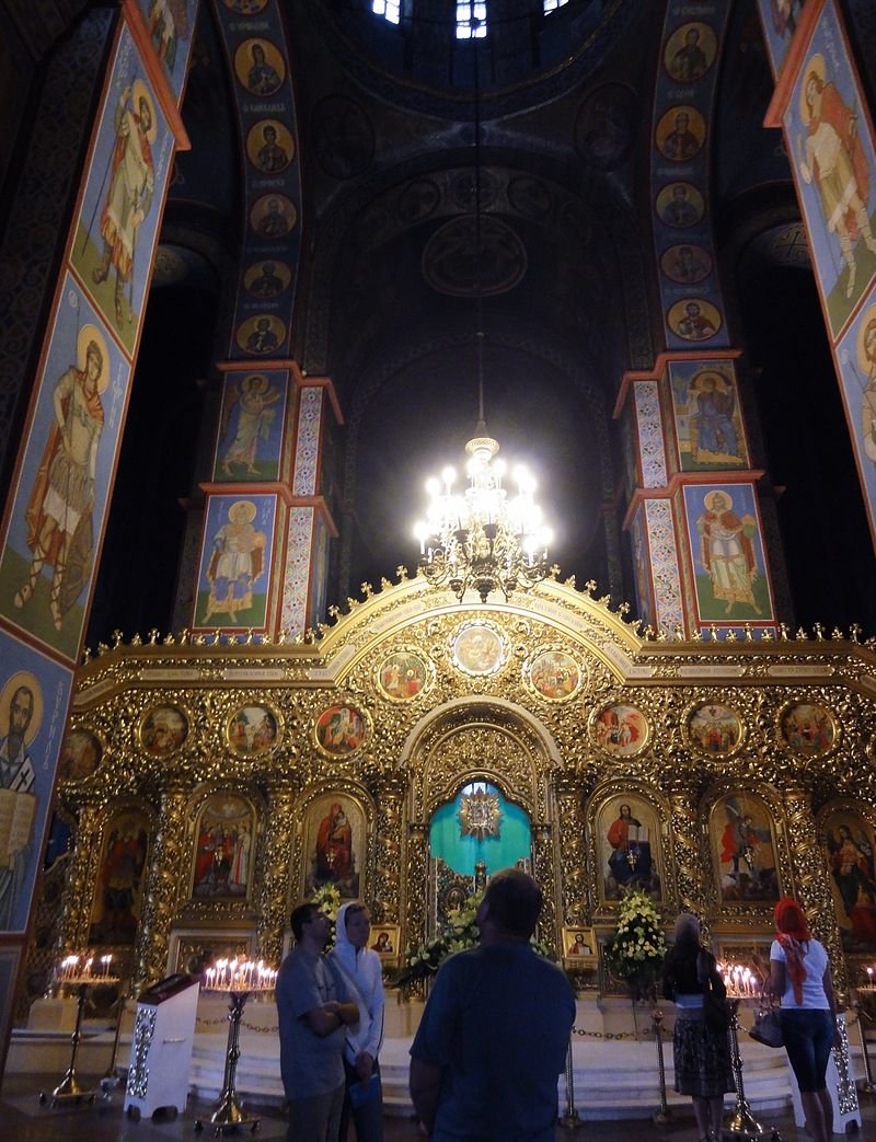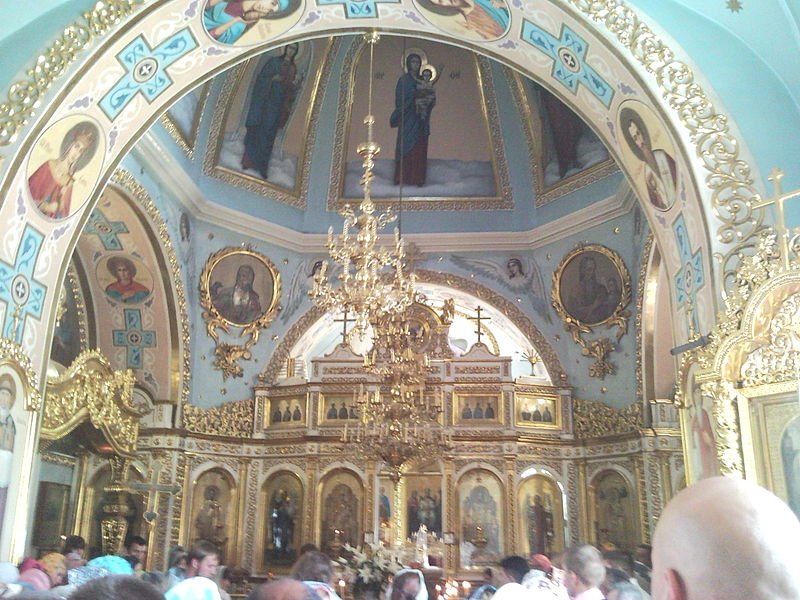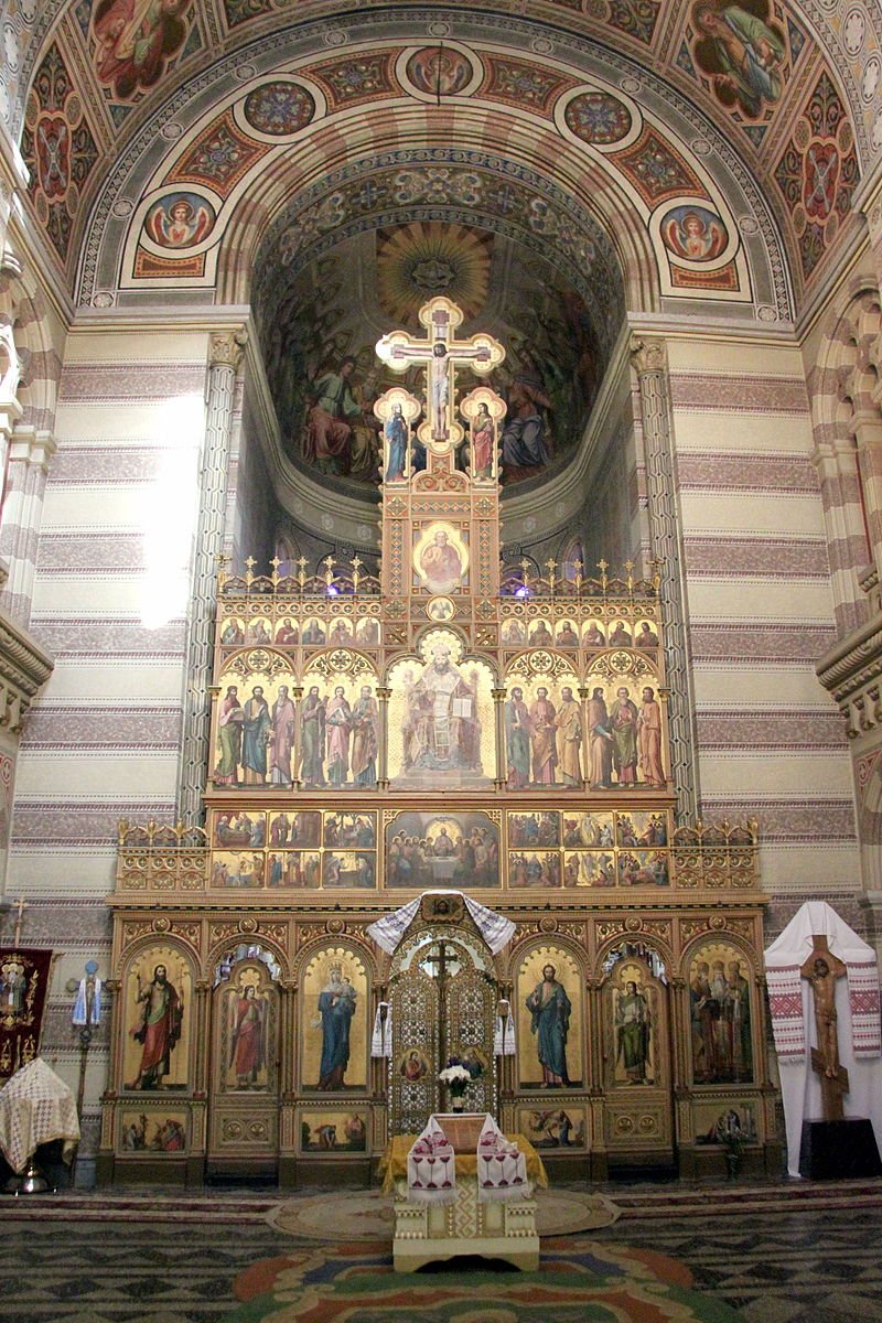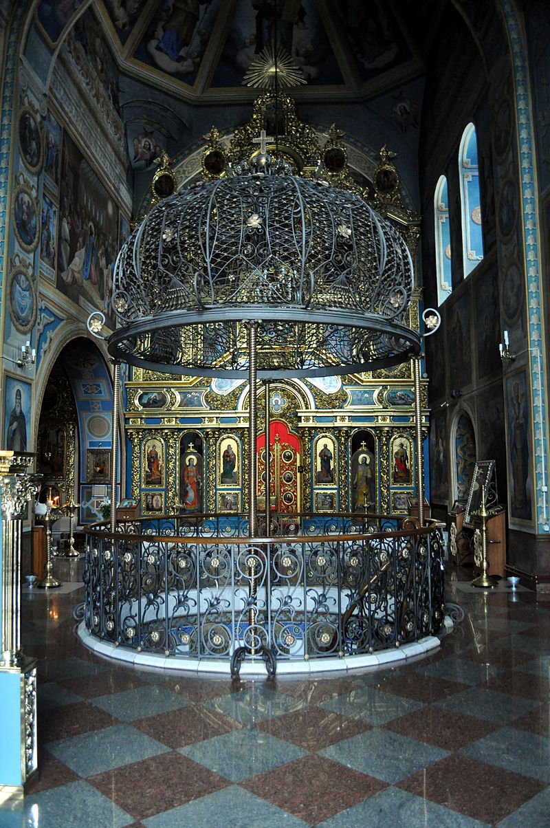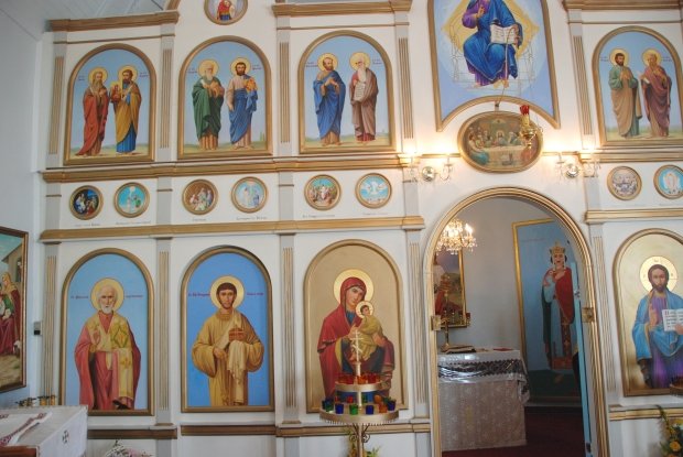 El Iconostasio tiene las puertas talladas y cubiertas con lámina de oro, y los íconos en estilo barroco ucraniano (siglo XVIII).