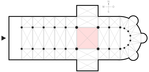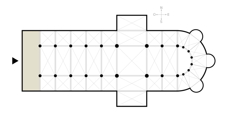 Un edificio con ábside de cinco esquinas, nave de planta cuadrada.