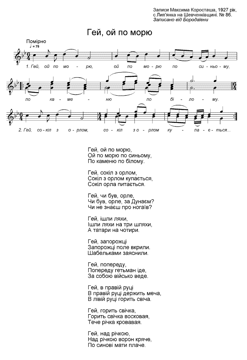 La melodía fue registrada en partitura en 1927 por Maxim Korostach, como proveniente del municipio de Shpolyansky aldea de Lypianka (№86, de Borodaivna).