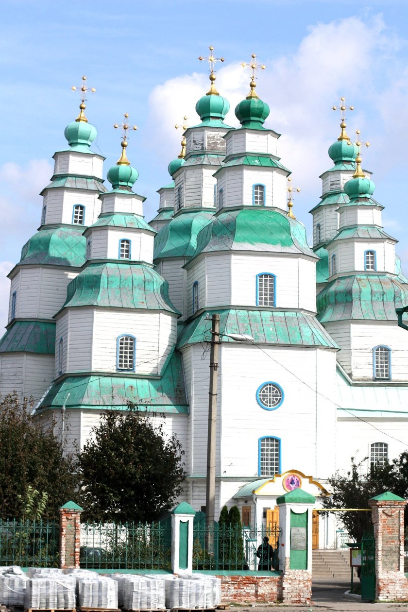 Ds la construcción religiosa en madera más grande de Ucrania, y fue construida del 2 de junio de 1775 al 13 de mayo de 1778 por los kozakos, sin el uso de un solo clavo de metal. Su cupula mas alta, central en una construcción de 512 m². , está a 65 mt de altura. El campanario fue construido después.