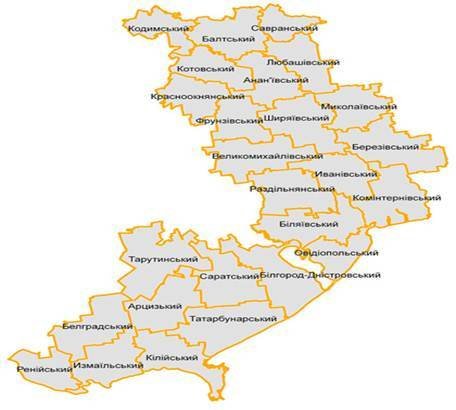 Esta es la mayor provincia de Ucrania en cuanto a extensión, y su tamaño se compara con el de Bélgica o los Países Bajos. La longitud de las línea costera en el mar y estuarios alcanza los 300km, y la frontera estatal 1200 km.Ocho puertos marítimos, 80,000 hectáreas de viñedos y cinco de los lagos mas grandes del país. Uno de ellos es el Yalpuh, tan grande como la propia ciudad de Odesa.
