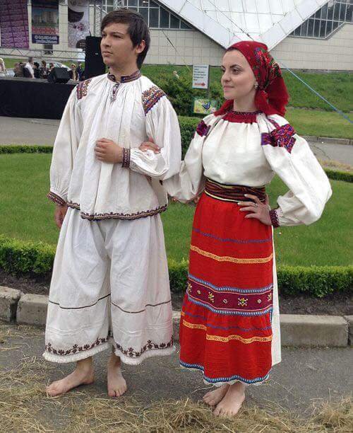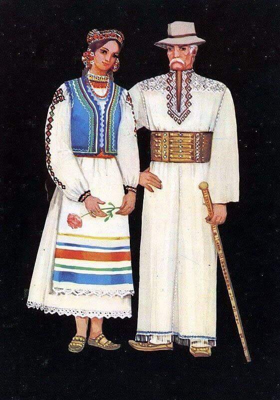 La próxima fotografía muestra una pareja en traje completo, de la aldea de Dovhe. La indumentaria del hombre guarda un poco de similitud con la de la planicie de Pannonian en Eslovaquia, y trajes del noroeste de Rumania, Hungría y el este de Croacia.