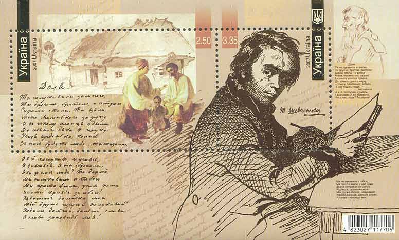 Este bloque No59, de Estampillas postales de Ucrania del año 2007 (Nºs 806 y 807), está dedicado al aniversario de nacimiento de Tarás Shevchenko (que, por cierto, acaba de ser su aniversario 211). Nació en Mórintzi, una aldea dentro de la provincia de Kyiv, en una familia de campesinos siervos. A la edad de 13 años quedó huérfano de padre y madre y, trabajando como criado, lo tomó como pupilo un sacristán, quien le enseñó a leer y a escribir.